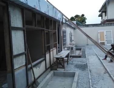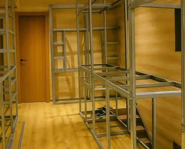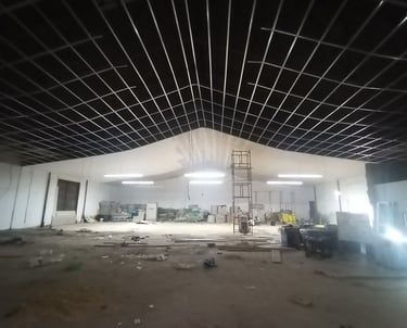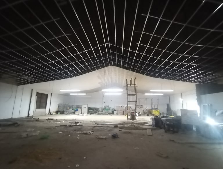 1800 m² de faux plafond en BA13 pointe de pignon à + 10m. Charpente métallique .un défit