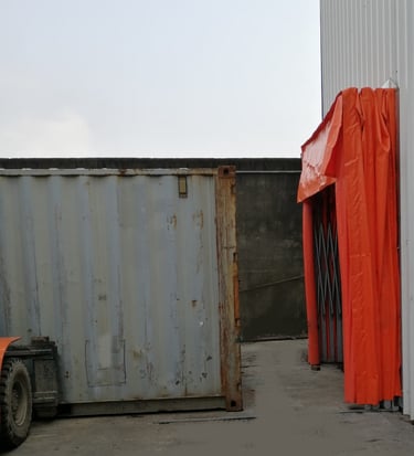 Pour répondre aux exigences d'une multinationale souhaitant sécuriser l'exportation de produits agricoles (cacao, par exemple) contre toute intrusion d'insectes durant le processus de chargement, Les Ateliers de Christophe ont conçu un tunnel de chargement rétractable. Cette structure permet de créer un sas étanche entre la zone de prise en charge des palettes par les gerbeurs et l'intérieur du container, garantissant ainsi un transbordement sans contamination. Ce concept peut être adapté à d'autres usages, comme sur un stade ou un quai de manutention